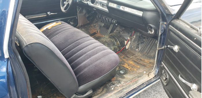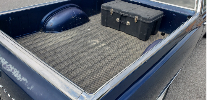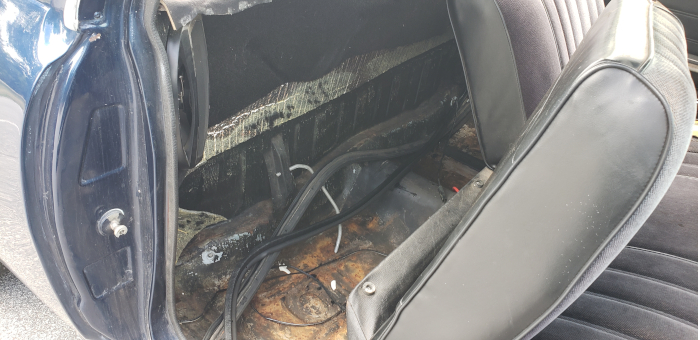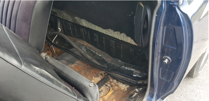 I pulled the carpet out the day after it arrived. We had a rainstorm and it was soaked. The floorboards only have surface rust, so that's a big win! We'll get the back glass out and resealed as well as fill in the holes in the body from the radio antennas.